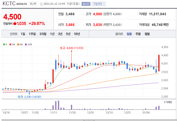 KCTC는 1월 12일 전일대비 +29.87% 상승한