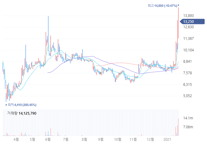 1월 20일에는 전일대비 +28% 정도 상승하여 13,400원 정도에