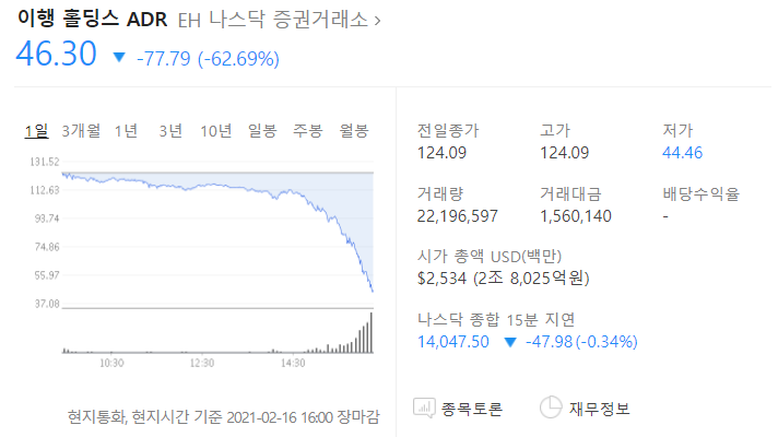 이항 홀딩스의 주가는 전일대비 62.69% 하락한 46.30달러로 마감하였는데