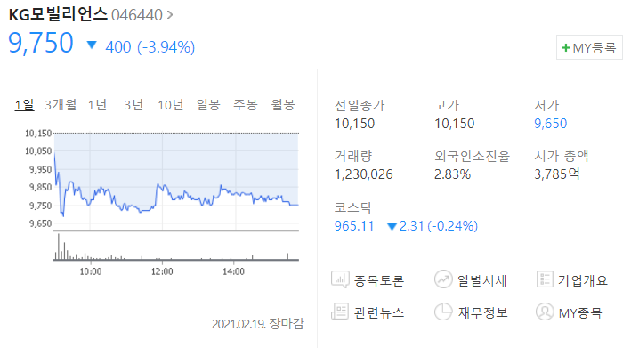 19일에는 다시 하락하여 9,750원에 마감하였습니다.