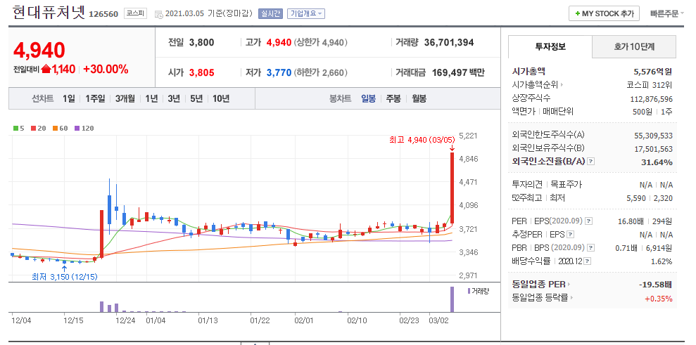 당일 주가는 전일대비 +30.00% 상승하여 상한가 4,940원에 마감하였습니다.