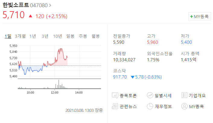 메타버스 관련주로 한빛소프트도 주목받고 있습니다.