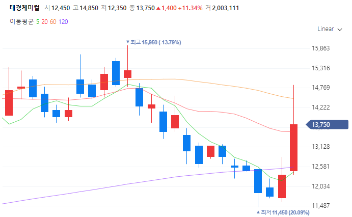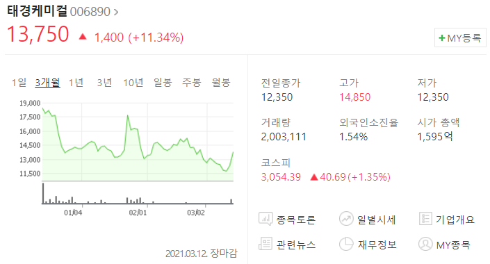 태경 케미컬의 주가는 장중 최고가 14,850원을 기록한 후