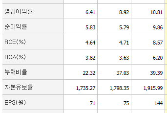 EPS(주당순이익)이 144원으로 2018년에 비해서 90% 이상 상승하였는데