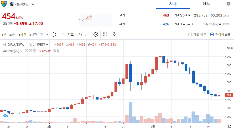 한때 에어드랍 이슈로 인해서 넴 코인 거래량은 비트코인이나 이더리움에