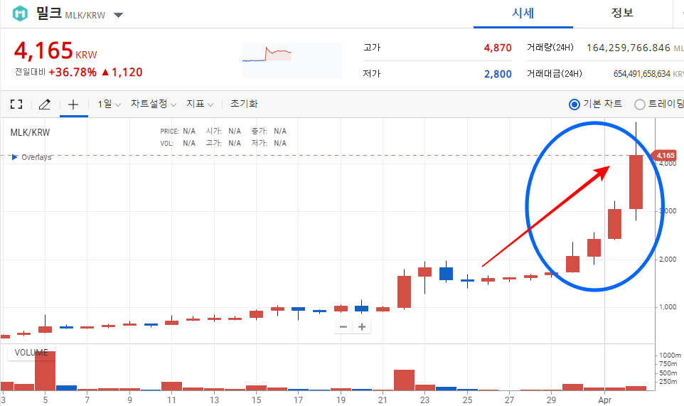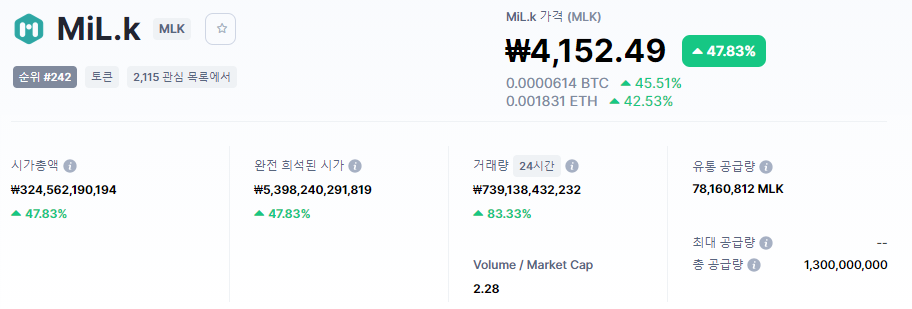 밀크 코인 또한 연일 상승세를 기록하고 있습니다.