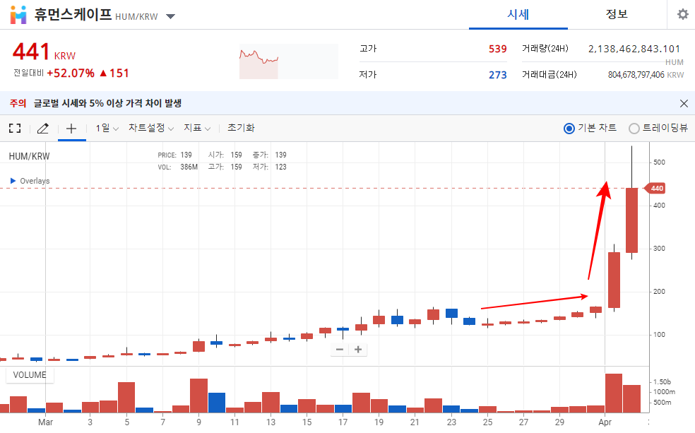 업비트 기준 최고점 539원을 찍은 다음 현재는 441원에 거래되고 있는데