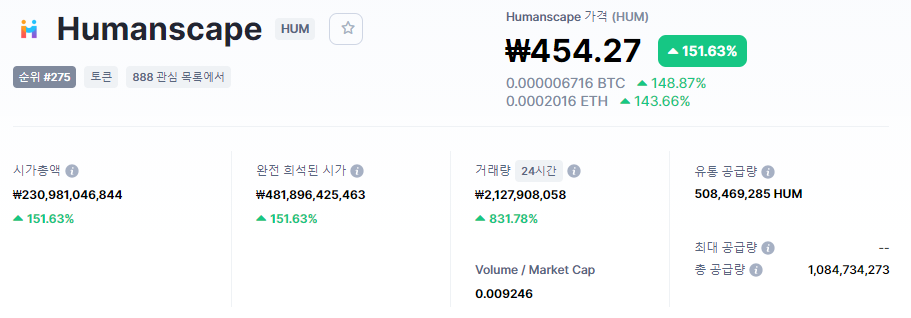 현재 유통 공급량은 508,469,285 HUM입니다.