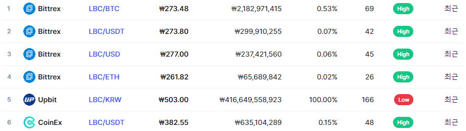LBRY 코인의 거래량이 업비트에서 100% 이루어지고 있어