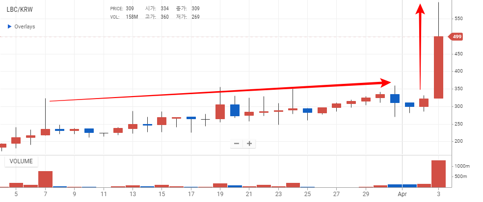 횡보하고 있던 엘비알와이크레딧 코인이 금일 갑자기 50% 이상 급등하였는데