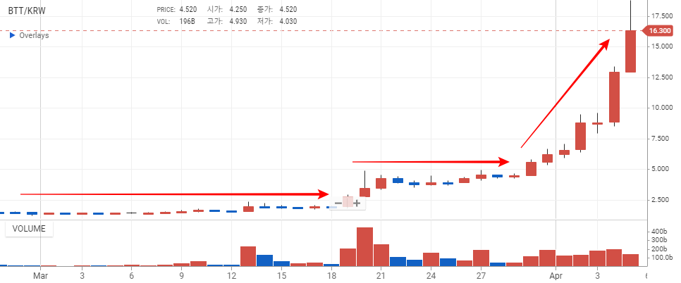 트론(TRX)의 호재가 터질때마다 비트토렌트 역시 급등세를 보였습니다.