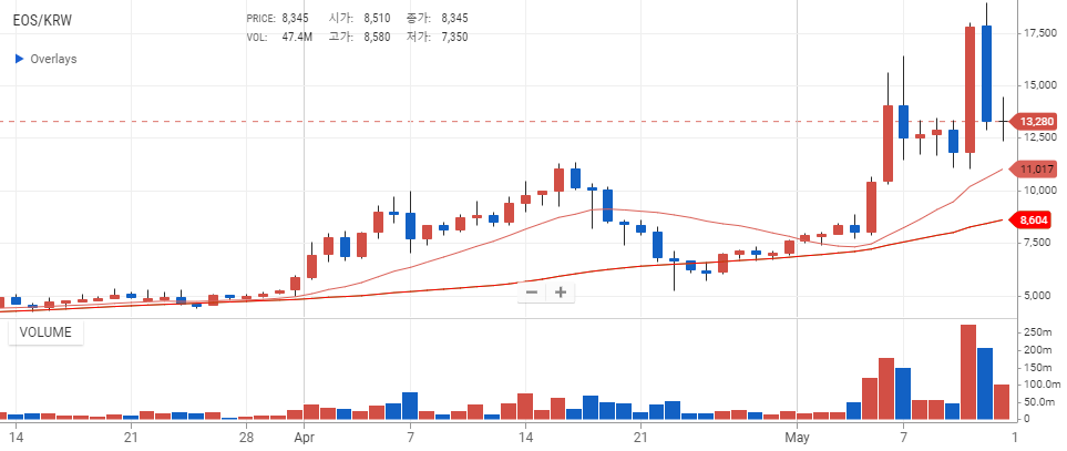 5월 11일 전일대비 +50% 이상 상승하는 모습을 보이며 업비트 기준 거래대금 1위에 올랐지만