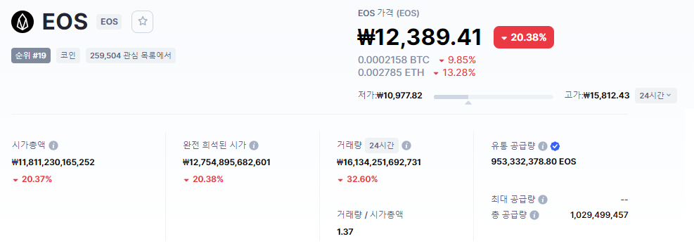 이오스 코인의 시가총액은 약 11조 원 정도로 순위 19위에 랭크되어있어