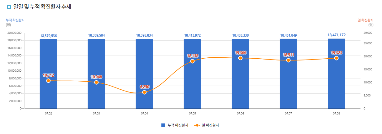 7월 8일 기준 코로나 총 누적 확진자 수는 18,471,172 명으로 대한민국의 인구수 51,628,117 명으로 계산해보면 전체 인구의 약 35.8%가 코로나에 확진되었거나 경험이 있다고 볼 수 있습니다.