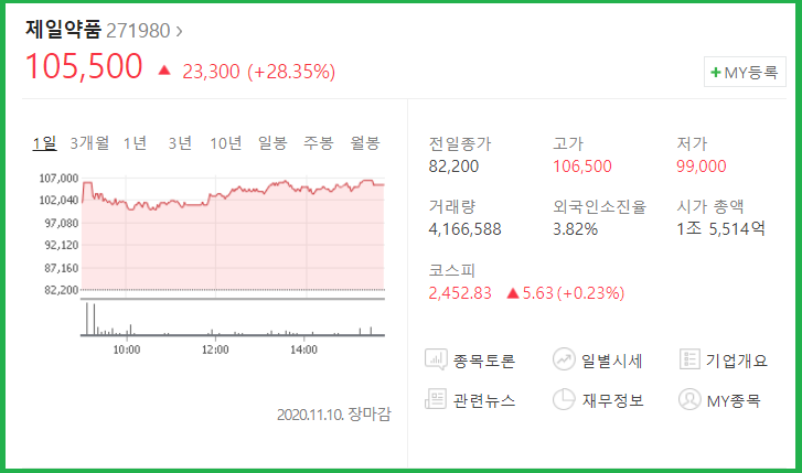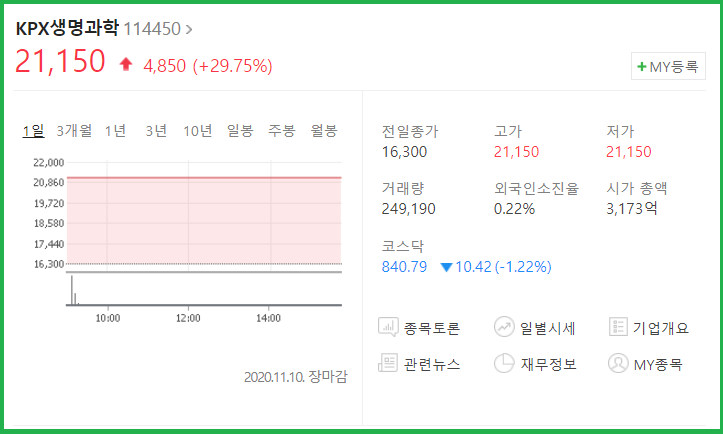 11월 10일 현재 KPX생명과학 21,150 ▲ 4,850 (29.75%)를 기록하여