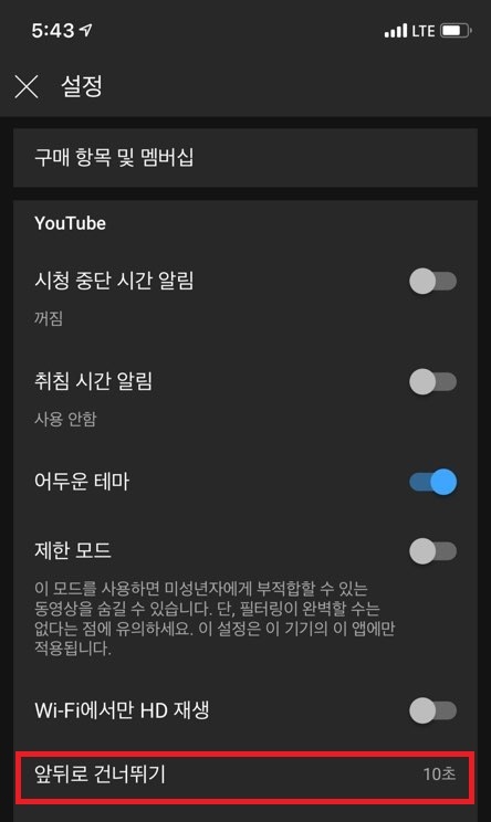 이렇게 5초 ~ 60초 사이로 앞뒤로 건너뛰기 설정을 할 수 있습니다.