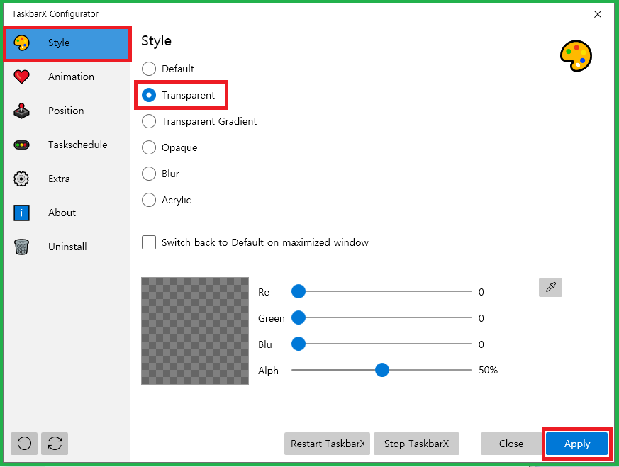 TaskbarX Configurator.exe 프로그램을 실행하시면 위와 같은 TaskbarX 설정하는